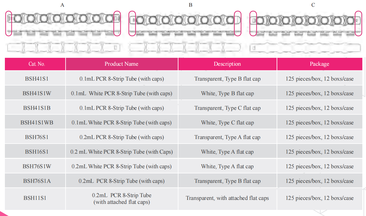 PCR 8-strip tubes are small tubes arranged in strips of eight, commonly used for PCR amplification and related applications in molecular biology research and diagnostic testing. They are designed to accommodate small volumes of samples and are compatible with various PCR instruments, making them essential tools for DNA amplification, genotyping, gene expression analysis, and pathogen detection. PCR 8-strip tubes are available in both white and transparent variants. The white tubes are suitable for top reading of fluorescence signals, offering higher sensitivity, while the transparent tubes are suitable for reading fluorescence signals from the top, bottom, and sides, ensuring compatibility with a wider range of machines.