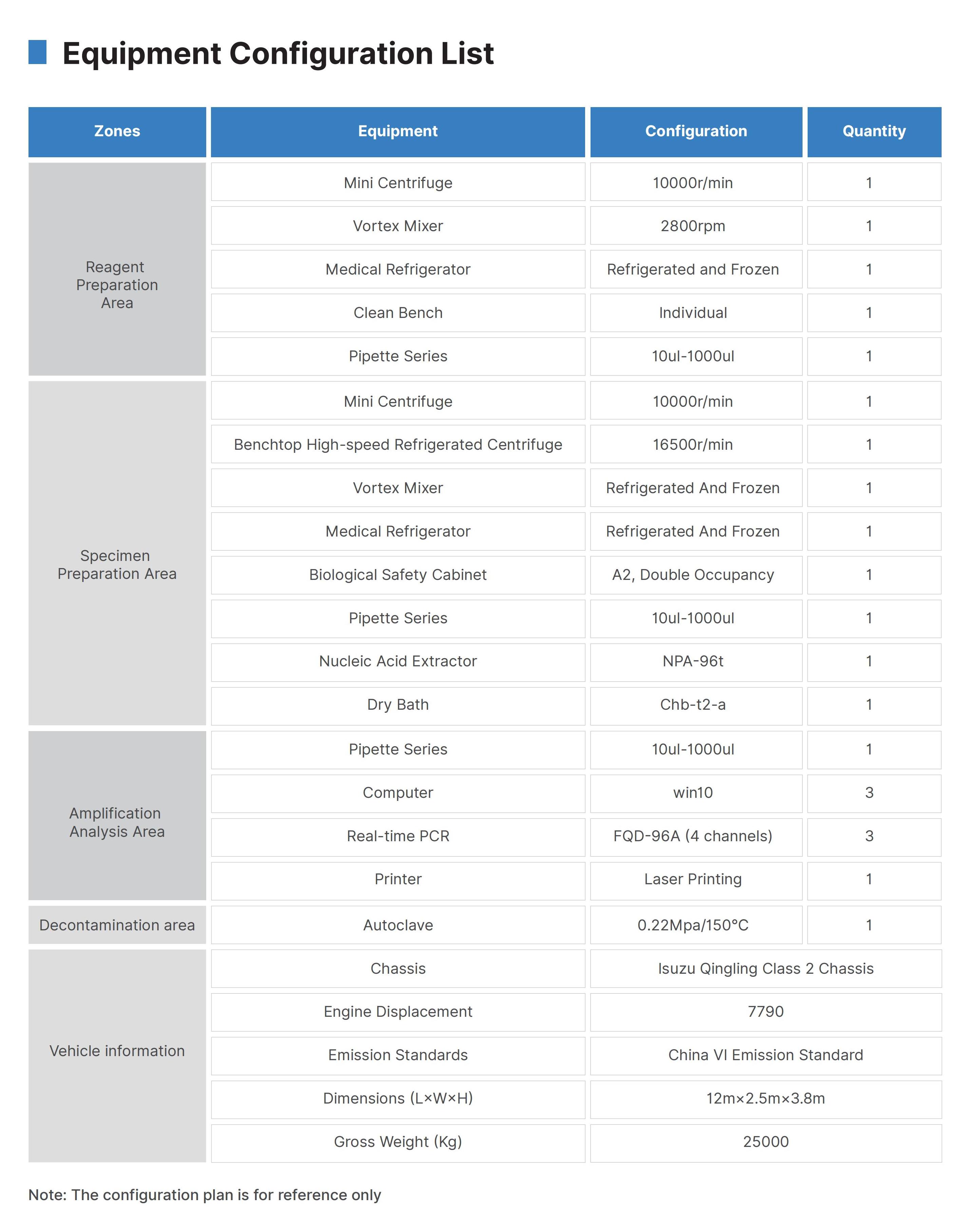 Bioer Technology's mobile PCR testing laboratory is converted from a 9m×2.5m container. It meets the biosafety P2+ level. The laboratory is produced using standardized factory processes, fully equipped with experimental equipment, reagents, and consumables for each section. Upon arrival at the site, it can be directly put into use for convenient, rapid, and safe testing. The testing capacity can reach 3,000 tests per day (24 hours).