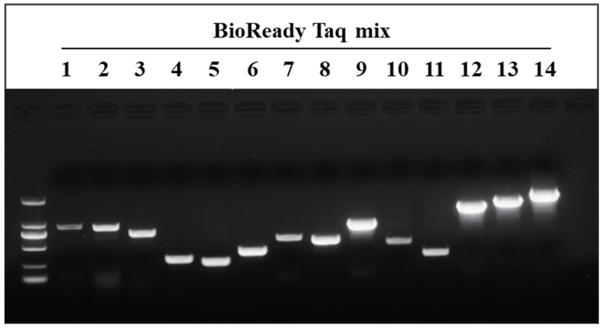 1. The experiment was conducted using BioReady Taq Mix to amplify fragments of different origins and lengths. The results of agarose gel electrophoresis are shown in the following figure: 1-3: Yeast, Shiitake mushroom, Oyster mushroom gDNA; 4-6: Feline herpesvirus, Pseudorabies virus, Avian Chlamydia gDNA; 7: Mouse cDNA; 8-9: Arabidopsis gDNA; 10-11: Human gDNA; 12-13: Lambda DNA; 14: Escherichia coli gDNA.