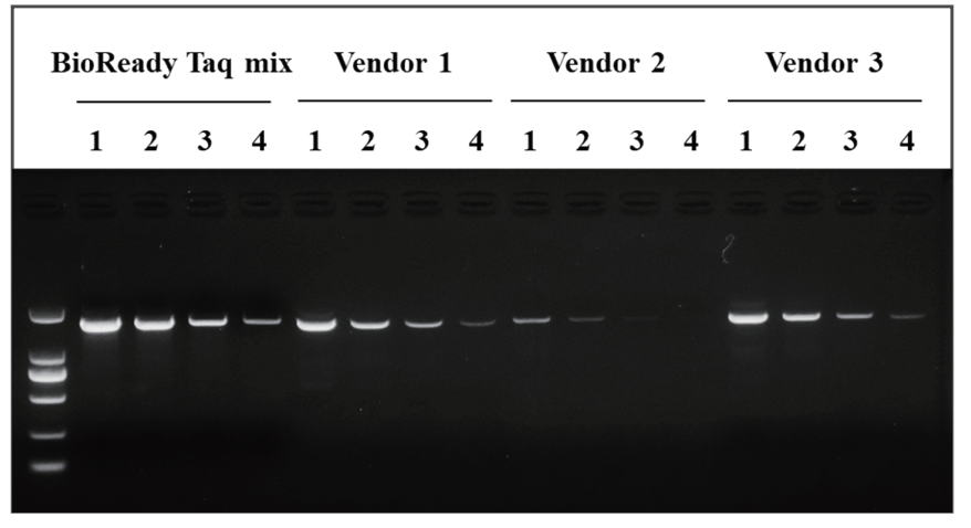 2. The experiment involved diluting high-concentration Escherichia coli DNA to concentrations of 0.4 ng, 0.2 ng, 0.1 ng, and 0.01 ng (as labeled in the gel image: 1-4). Different DNA amplification reagents, including BioReady Taq Mix from Bioer, as well as three competitive products (labeled as Vendor 1-3), were used to amplify a 16S target gene segment (1470 bp) to assess the sensitivity of the reagents.