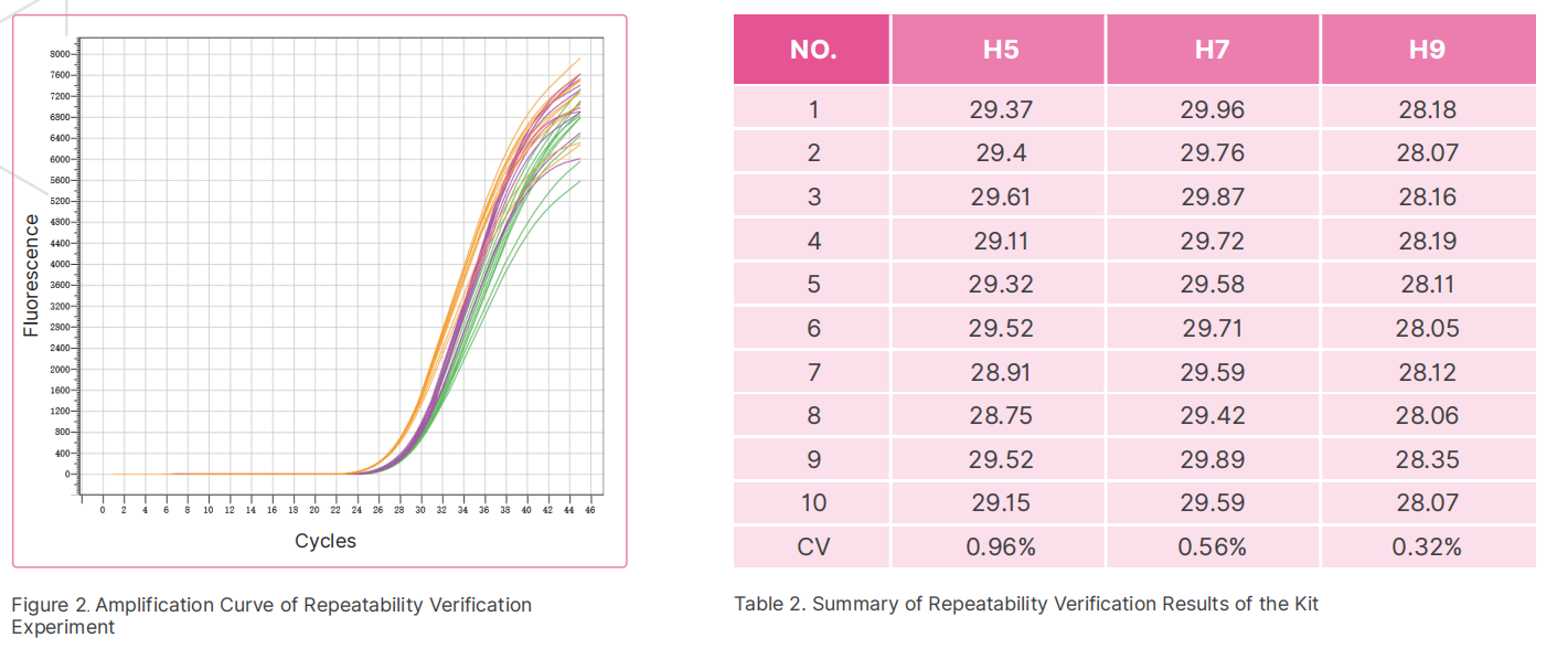 104 copies/mL of avian influenza H5N1, H7N9, and H9N2 positive samples were repeat 10 times using the avian influenza virus H5/H7/H9 subtype Lyophilized nucleic acid detection kit (fluorescence PCR method). After statistical analysis, it was found that the co-efficient of variation (CV) of Ct values for each subtype detection result was less than 1%, indicating that the precision of the kit was good and the experimental results were reliable.