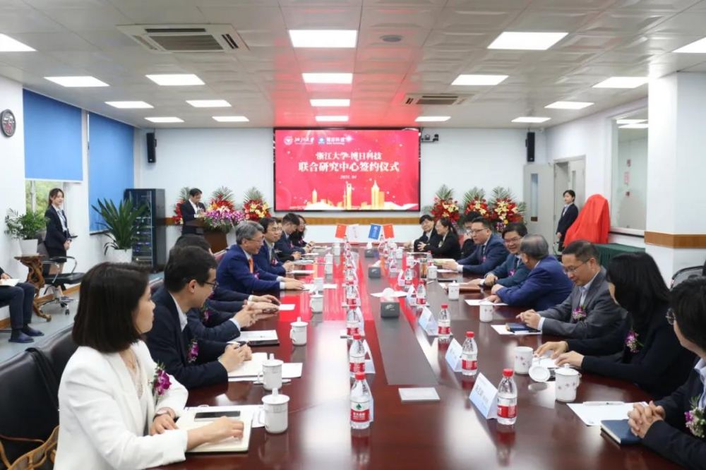 A signing and listing ceremony was held at the site, and Li Zhilong, Zhang Hong, Tao Feng and he Xianhan unveiled the "Zhejiang University Bioer science and technology joint research center".