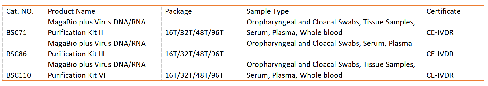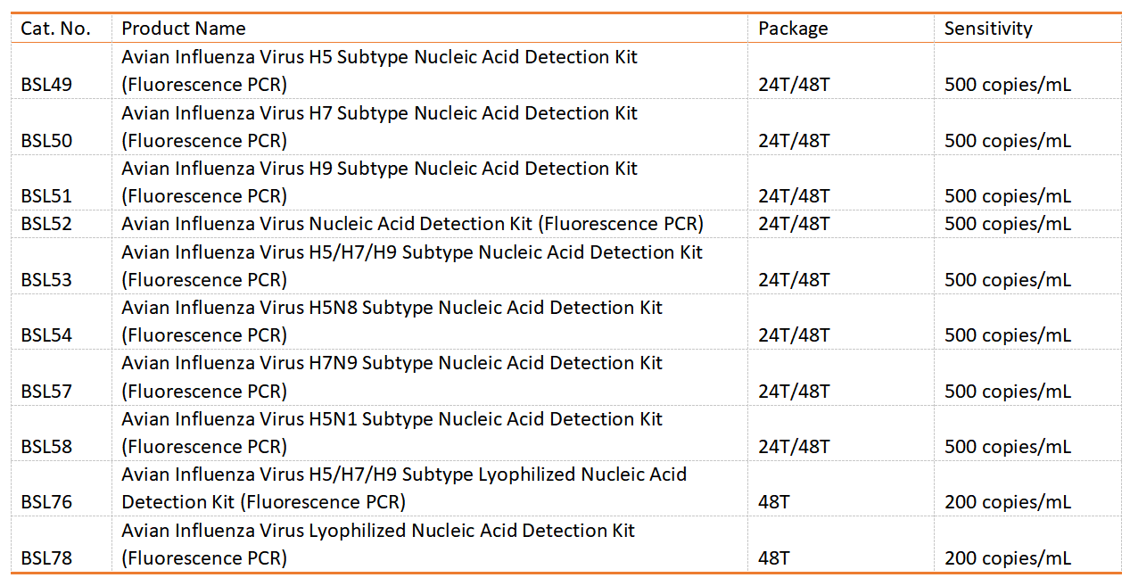 Avian Influenza (AI) is a highly contagious viral disease that affects birds, with potential transmission to humans and other animals. It poses a significant threat to poultry health, public safety, and the economy. The disease is caused by influenza A viruses, which are further classified by their hemagglutinin (H) and neuraminidase (N) subtypes. Among them, H5, H7, and H9 subtypes are the most prevalent in poultry outbreaks. In particular, H5N1 and H7N9 have caused severe epidemics, with H5N1 noted for its high pathogenicity and zoonotic potential. Clinical symptoms in birds include respiratory distress, reduced egg production, edema, cyanosis, and sudden death in severe cases. Rapid and accurate detection of the virus is essential for effective surveillance and containment. Bioer Technology offers a complete solution for avian influenza virus detection — from sample collection and viral nucleic acid extraction to qPCR testing and result analysis. With a full suite of instruments and reagents, we support high-throughput, accurate, and efficient laboratory workflows, helping to safeguard animal health and food security.